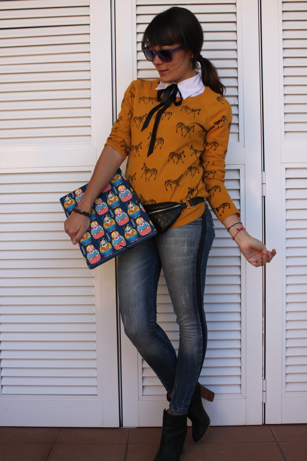 Ya se han terminado mis mini-vacaciones, ya se me ha pasado el jet-lag y retomar las clases de inglés ha sido lo primero que he tenido que hacer para volver a la rutina. Este ha sido el outfit que se me ha ocurrido para hoy. Están muy de moda los estampados animales en cardigans, jerseys, etc., y esta adquisición de Forever21 que os enseño mezcla el mostaza, color que estaba deseando adquirir en alguna prenda, y unas cebras muy graciosas. Mi carpeta de Flamenco y mi riñonera como portabolígrafos completan mi re-vuelta al cole. Cómodo y funcional. ¿Qué os parece? Un beso enorme y ya empieza en nuestras islas el Carnaval! Ya os iré enseñando mis ideas de disfraces. 😉